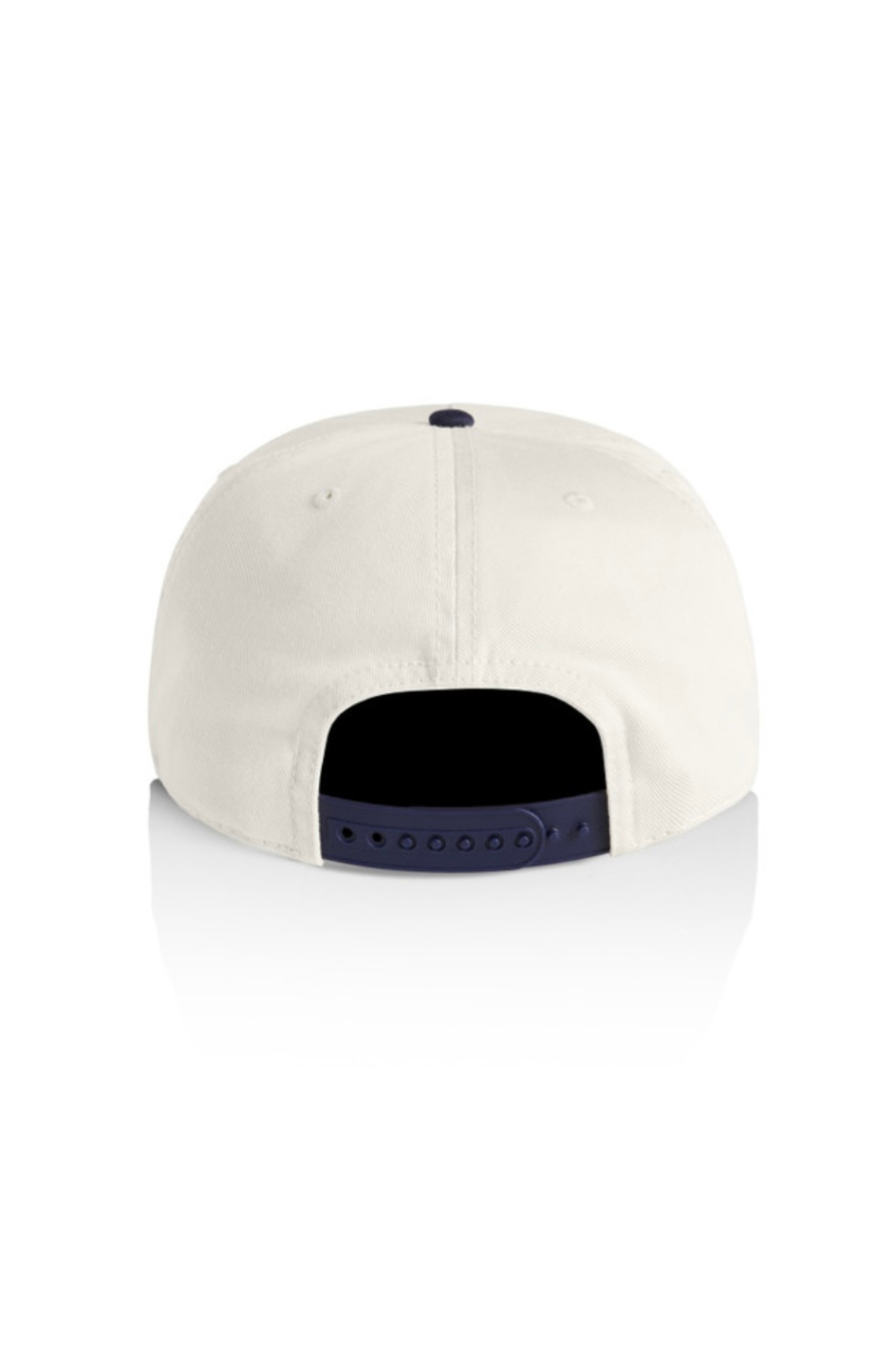 The natural / midnight, lightweight, five-panel cap made from 100% cotton, featuring a contrasting dome, plastic snap-back, flat contrasting peak and tonal eyelets.